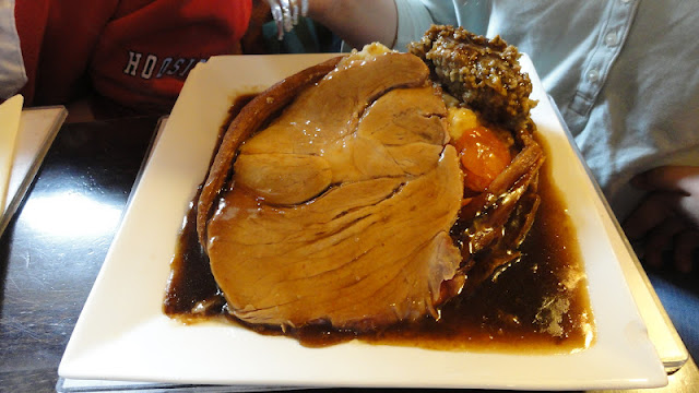 Since it is Sunday we had to have Sunday roast or eat elsewhere. I wanted to eat here so we chose to stay. We had two choices: First choice was meat - beef, pork, or lamb. Second choice was big Yorkshire pudding boat or small Yorkshire puddings on the side. We all chose the boat option and then each picked a different meat. After ordering we sat down to wait for our meal and watched some marathon race taking place in London. I don't know what the race was but thought the overhead shots of Tower Bridge and Tower of London were neat since I've been there. Definitely one of the many bonuses of travelling - seeing places on TV that I've seen in person. Within a seemingly few minutes they brought out the food - a huge (6-7 inch diameter) pudding bowl holding mashed potatoes, carrots, cabbage, and cauliflower topped with meat served Dana style - drowning in gravy. Very good and very, very big. We were all glad we stayed since it tasted better than we expected. But then again, what doesn't gravy make better?