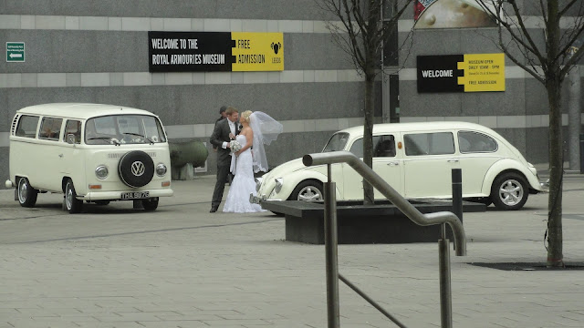 Here's for you Tara Schetzel. We were sitting at the Pizza Express for lunch after the museum and this bride and groom pulled up for pictures (their reception was in a banquet room inside the museum). We've seen Rolls Royce's used for wedding party transportation but this cream coloured stretch VW bug and matching love bus was a first for us. On a side note this sparked a wedding dress conversation from 10 year old Kalle. I'm not sure I am ready to have a daughter yet. Even scarier was hearing about one of her classmates who has her wedding planned already.