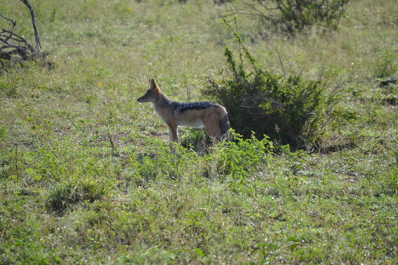 A black backed jackal strolling the grassland savanna. It was very green here because it had rained just before we arrived, typically the rain comes in the winter. The time of the year here is going from summer to fall so the rain is not typical but welcomed.
